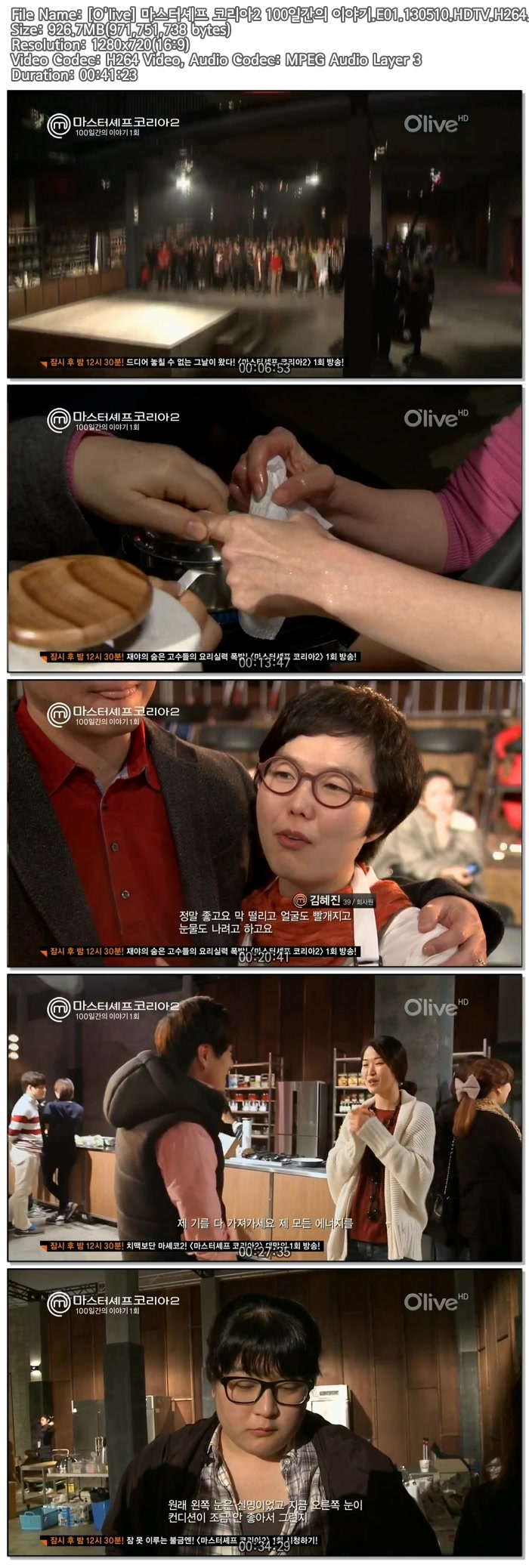 | [O'live] 마스터셰프 코리아2 100일간의 이야기.E01.130510.HDTV.H264.720p-iPOP.avi | 926.7 M | 00:41:23 | 1280x720 |