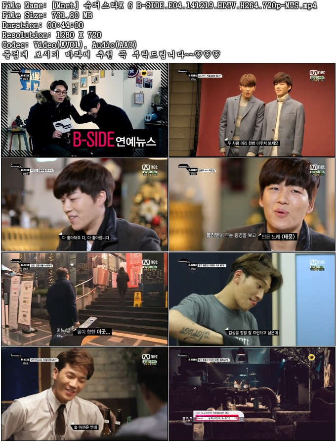 | [Mnet] 슈퍼스타K 6 B-SIDE.E04.141219.HDTV.H264.720p-MTS.mp4 | 731.8 M | 00:44:00 | 1280x720 |