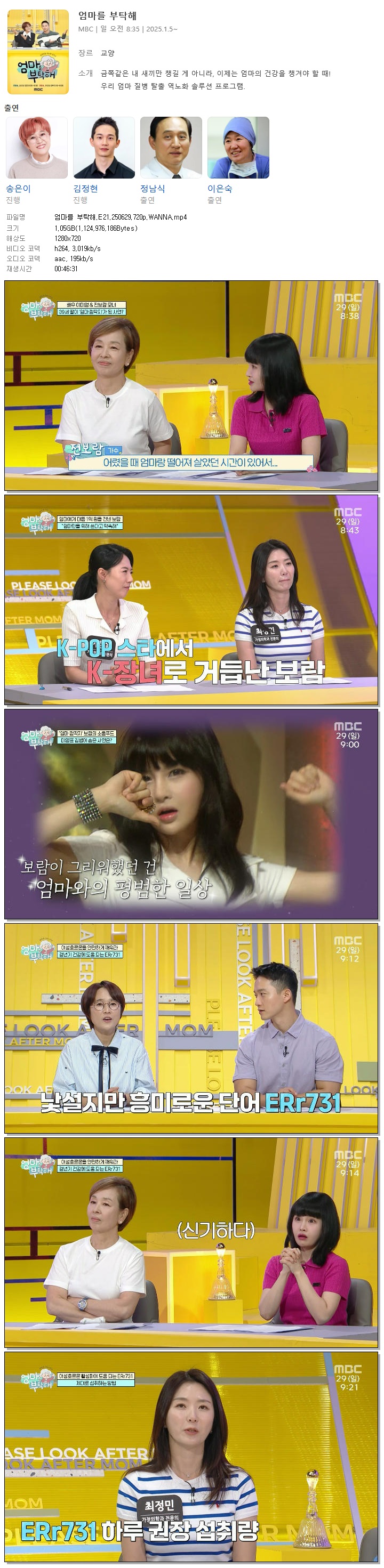 | [MBC] 엄마를 부탁해.E21.250629.720p.WANNA[송은이, 김정현].mp4 | 1 G | 00:46:31 | 1280x720 |
