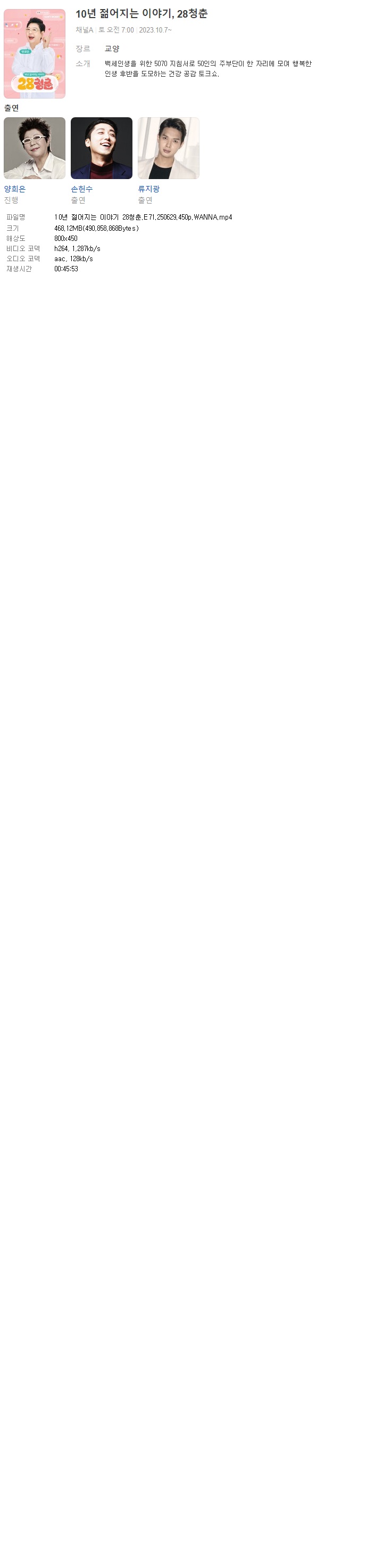 | [채널A] 10년 젊어지는 이야기 28청춘.E71.250629.450p.WANNA[양희은].mp4 | 468.1 M | 00:45:53 | 800x450 |