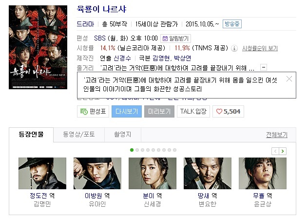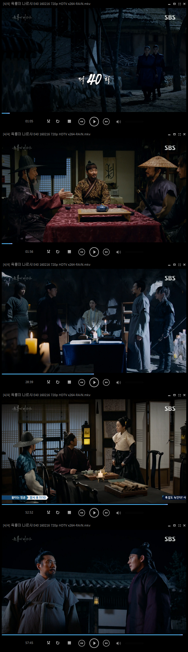 | 육룡이 나르샤 E40 160216 720p HDTV x264-RAiN.mkv | 1.2 G | 00:58:52 | 1280x720 |