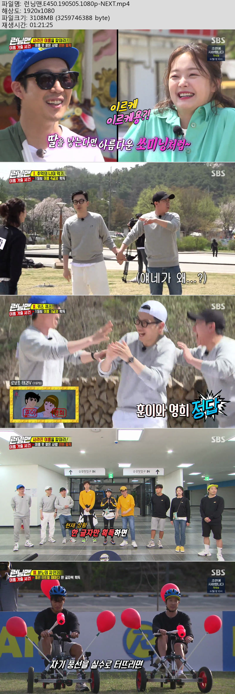 | 런닝맨.E450.190505.1080p-NEXT.mp4 | 3 G | 01:21:25 | 1920x1080 |