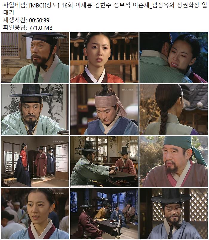 | [MBC][상도] 16회 이재룡 김현주 정보석 이순재_임상옥의 상권확장 일대기.mp4 | 771 M | 00:50:39 | 640x480 |