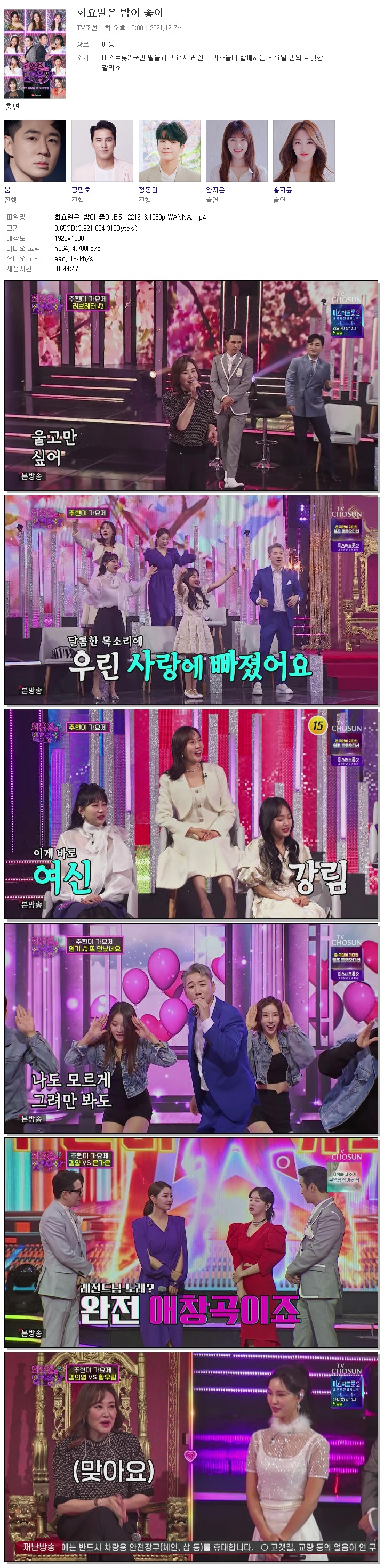 | 화요일은 밤이 좋아.E51.221213.1080p.WANNA.mp4 | 3.7 G | 01:44:47 | 1920x1080 |